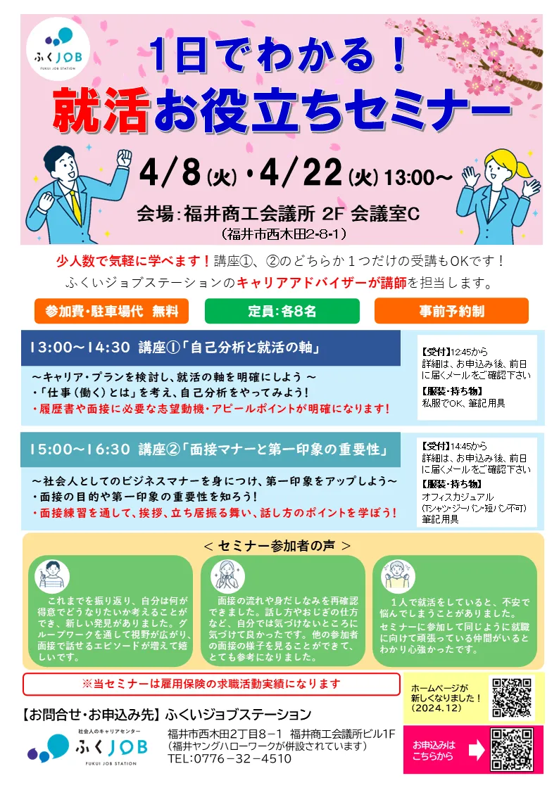 | <講義と実践練習> ~社会人としてのビジネスマナーを身につけ、第一印象をアップしよう~ ・面接の目的や第一印象の重要性を知ろう ・服装、挨拶、立ち居振る舞い、話し方のポイントを学ぼう! ・本番に備えて面接練習してみよう 【受付】14:45から 【服装】オフィスカジュアル(Tシャツ・ジーパン・短パンNG) 【持物】筆記用具 |