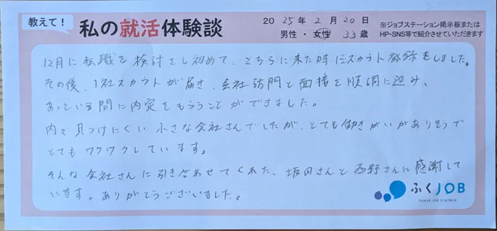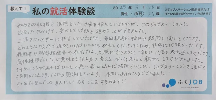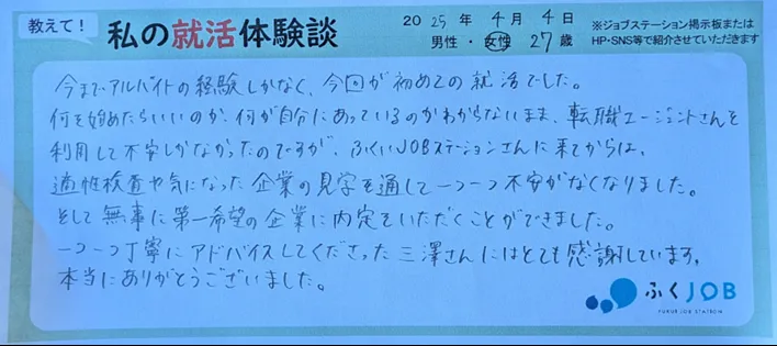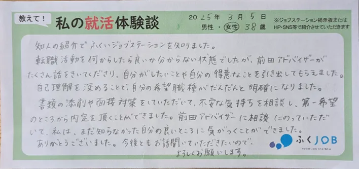 私が気になる企業への職場見学も対応してくださり、一番心配していた面接も前田さんのアドバイスのおかげで、本番ではあまり緊張せずに話すことが出来ました。